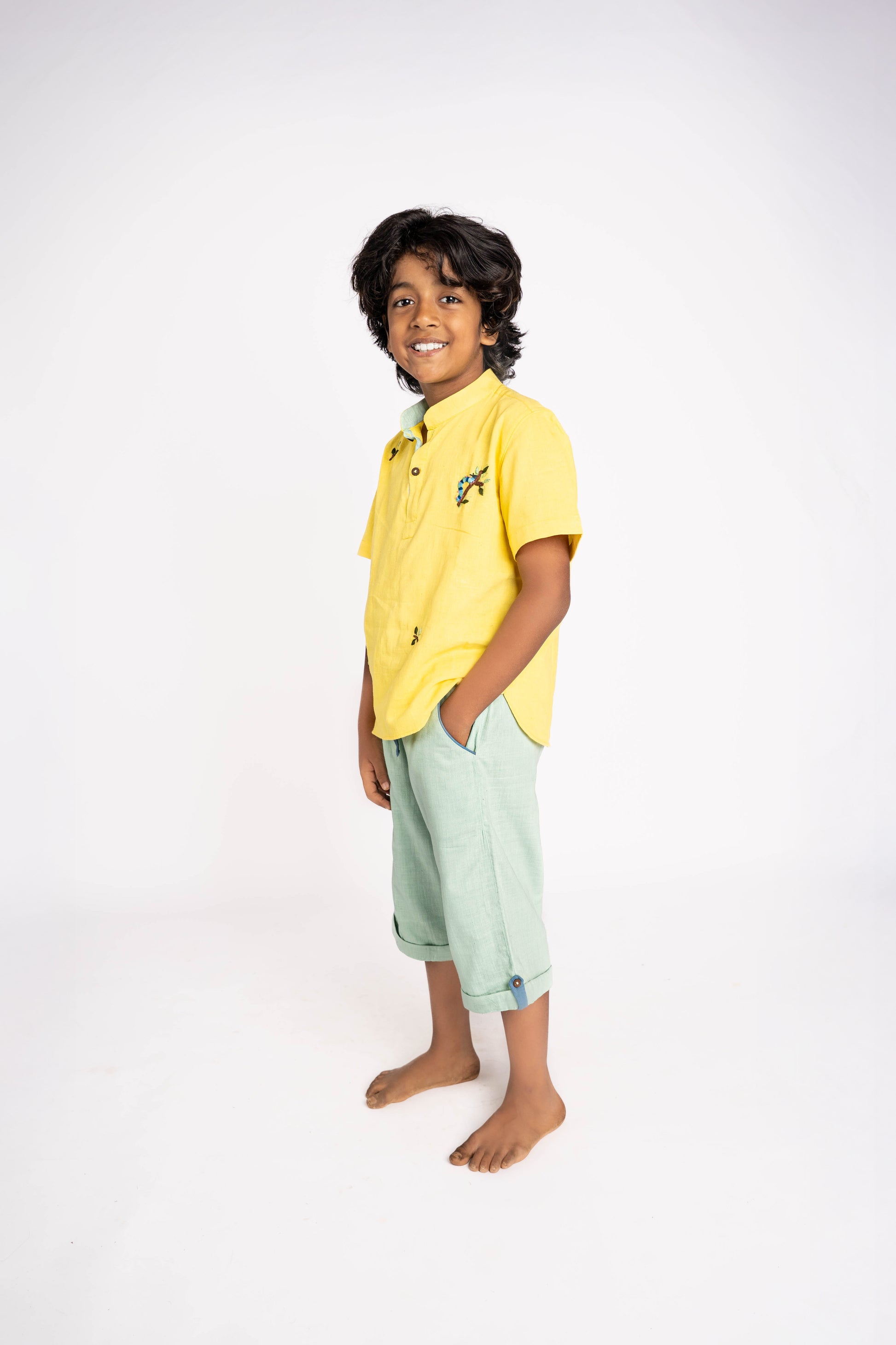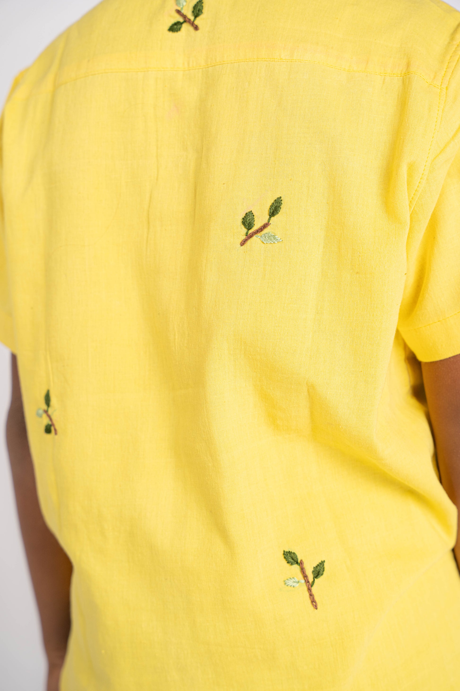 A soft kids’ half-sleeve shirt in warm yellow, with a mandarin collar and open placket. Powder-blue contrast and a delicate caterpillar-on-leaf embroidery add a playful, handcrafted charm.